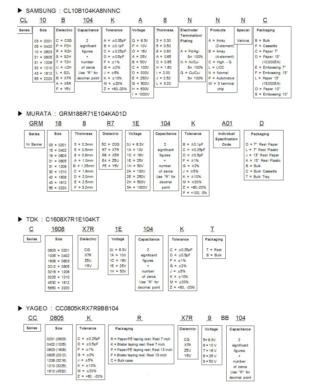 偏差:B=±0.1pF、C=±0.25pF、D=±0.5pF、F=±1%、G=±2%、J=±5%、K=±10%、M=±20%、Z=-20%+80%